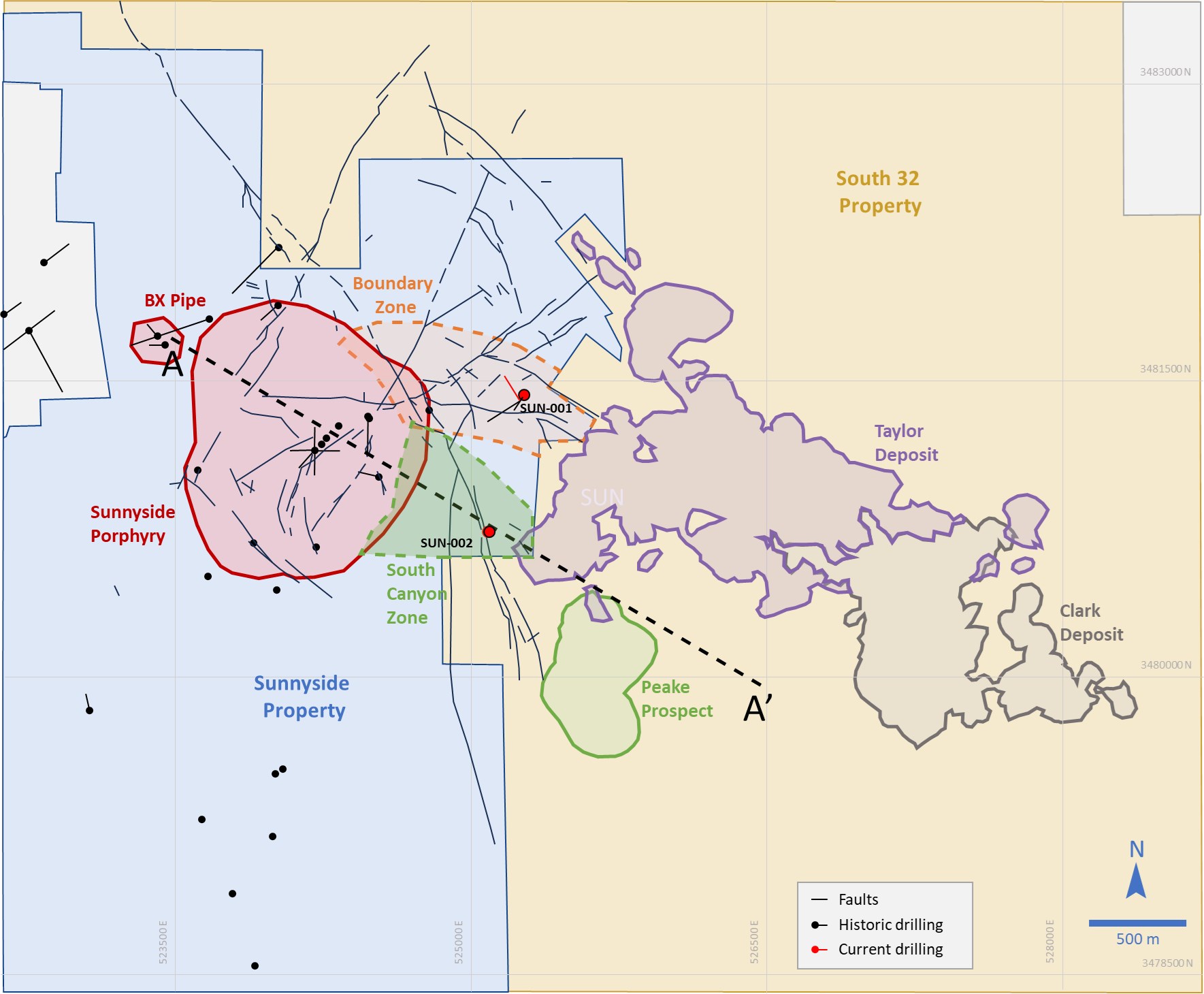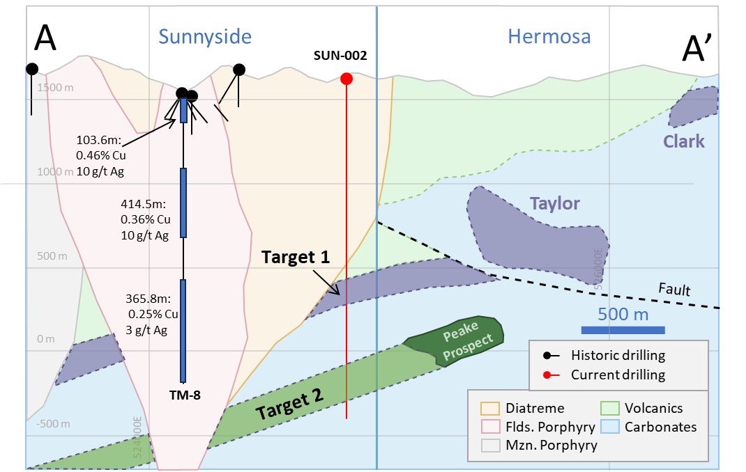 - Hole SUN-002 is targeting multiple carbonate horizons that have the potential to host CRD and skarn mineralization, including the extensions of the Taylor deposit and Peake prospects.